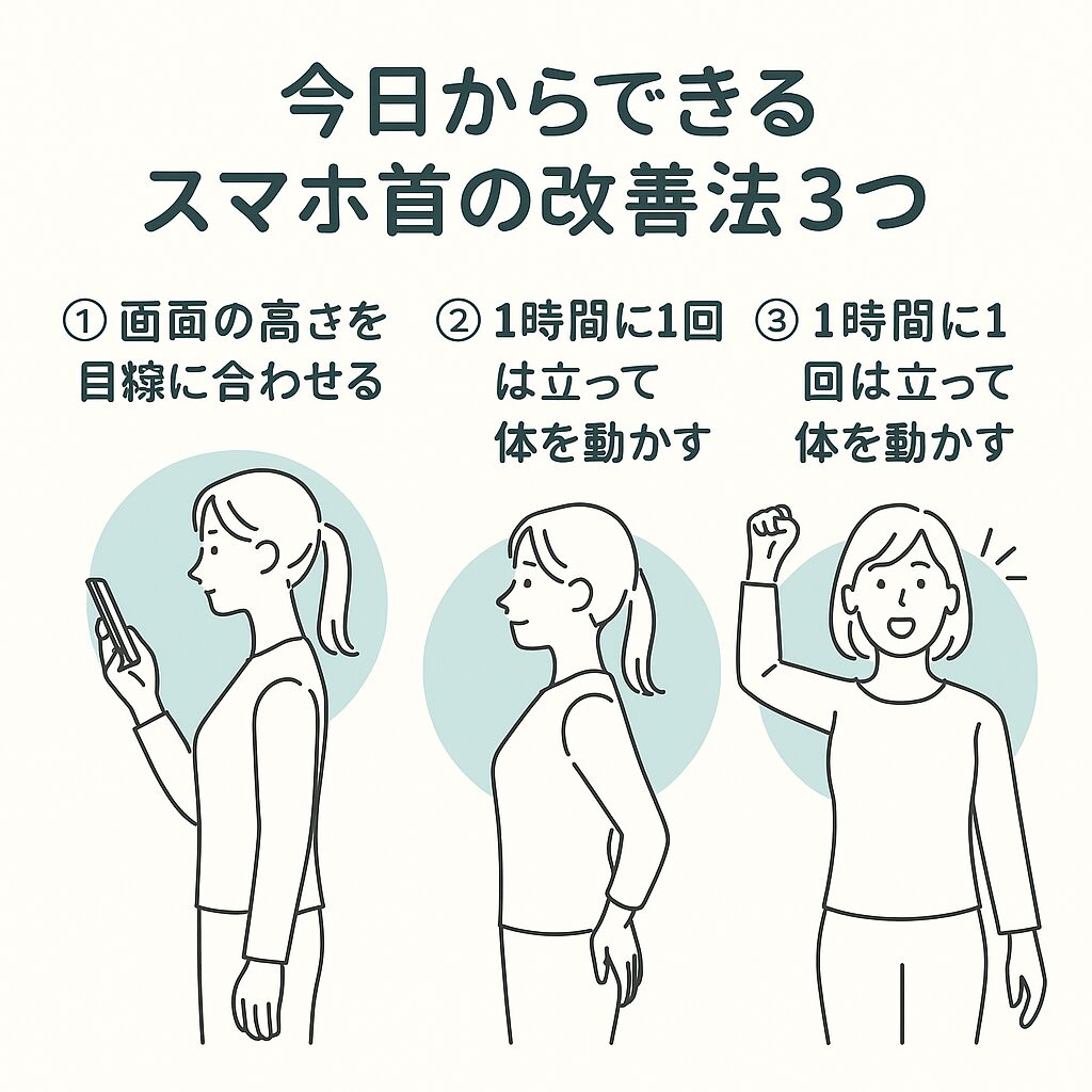 スマホを顔の高さまで上げて使うことで、自然と頭の位置が戻ります。
